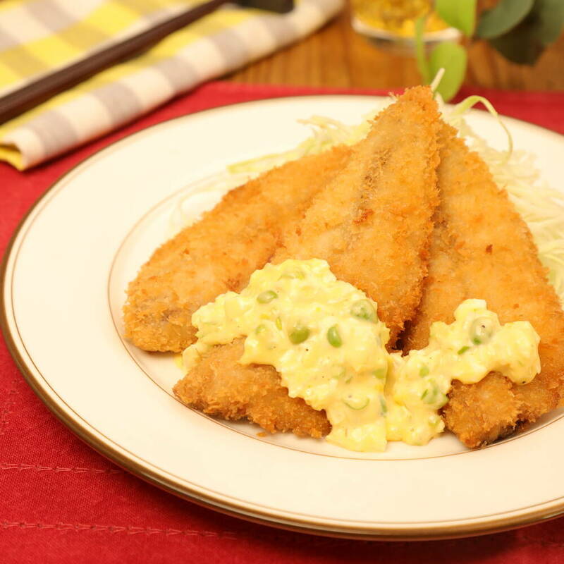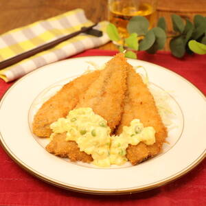 真鯵は三枚におろし、塩こしょう(分量外)をする。薄力粉を両面にまぶす。