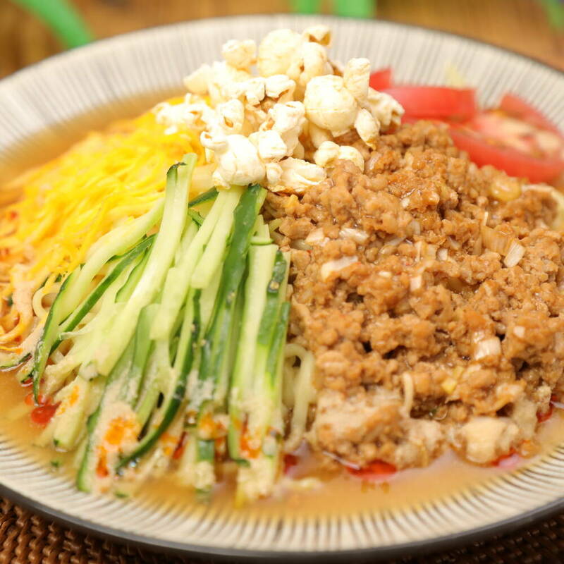 肉味噌、きゅうり、トマト、錦糸卵を盛り付ける。<7>をかけお好みでラー油をかける。ポップコーンを盛り付ける。
