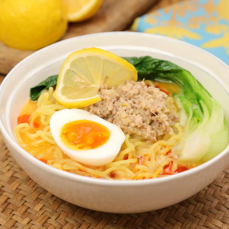 器に<9>を盛り、チンゲンサイ、半分に切った半熟卵、ひき肉をトッピングする。