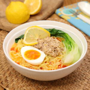 スープを温め<10>に注ぐ。レモンを飾り、お好みでラー油を回しかける。