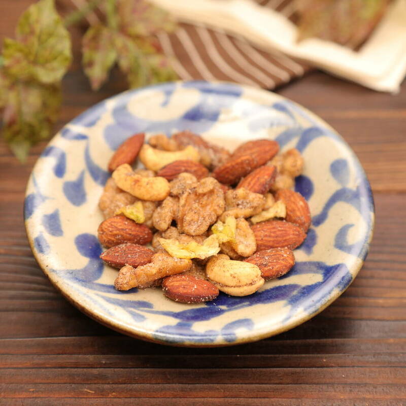フライパンにミックスナッツとごま油を入れて、よく混ぜ合わせる。