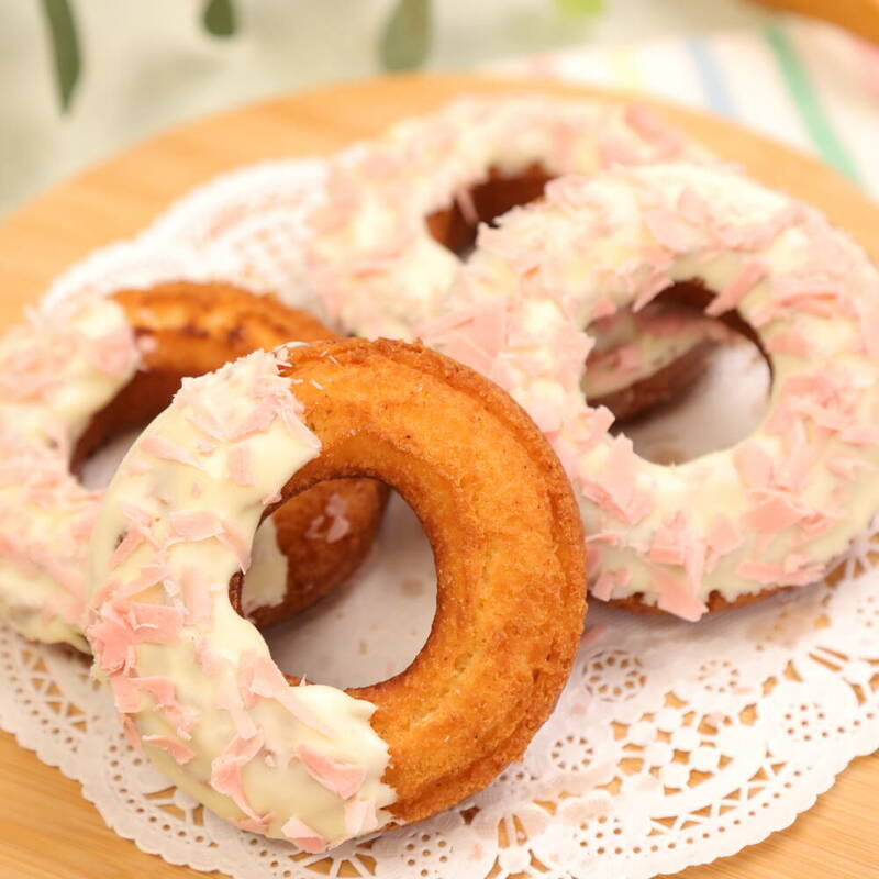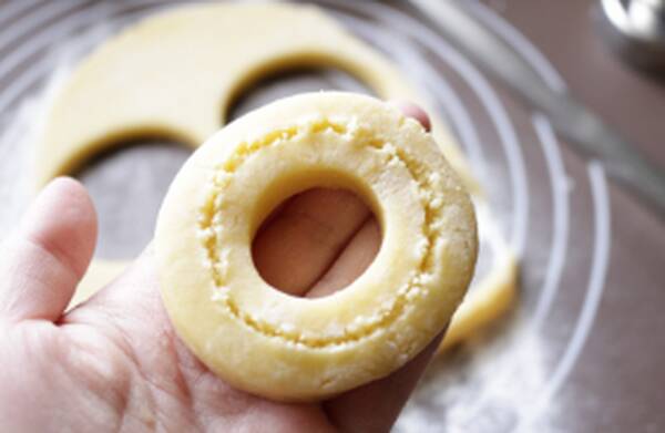クッキングシートではさみ、麺棒で厚さ1cmに伸ばす。セルクル7cmで抜き、更に3.5cmで抜いてリング状にする。