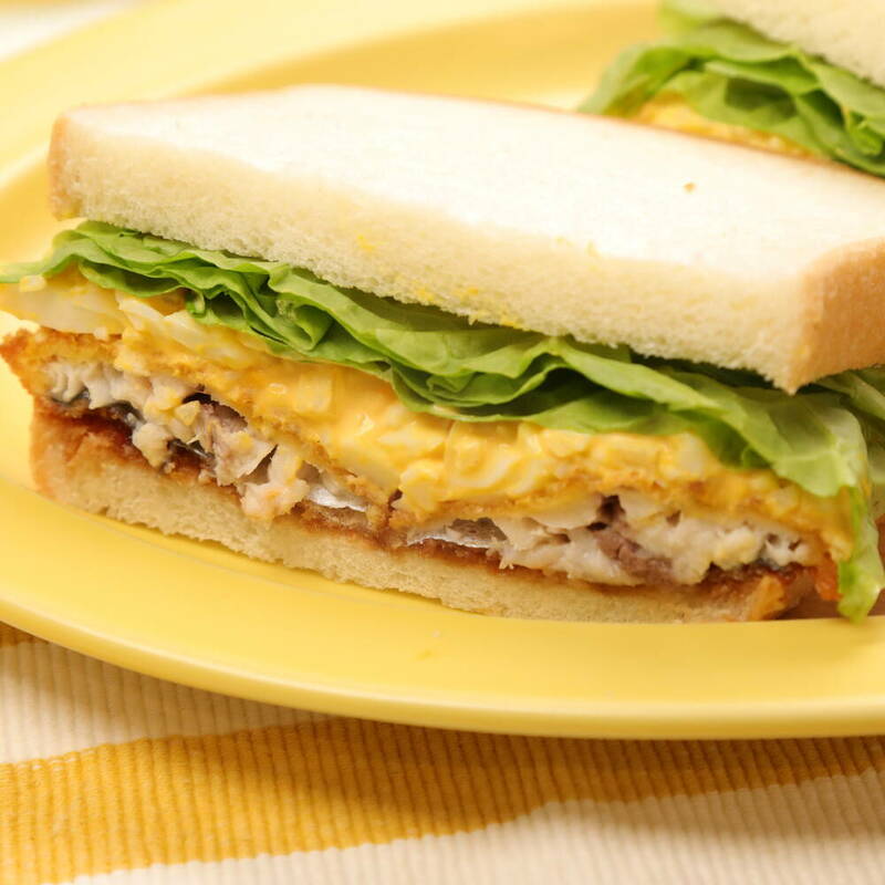 食パンにレタス、<2>、アジフライの順に重ね、【C】を混ぜ合わせてかけて食パンで挟む。