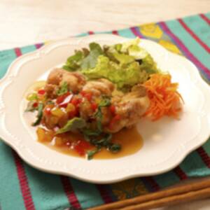 <1>の鶏肉に【C】をまぶす。中温に熱したサラダ油で6~7分揚げる。器に盛り付け<6>をかける。