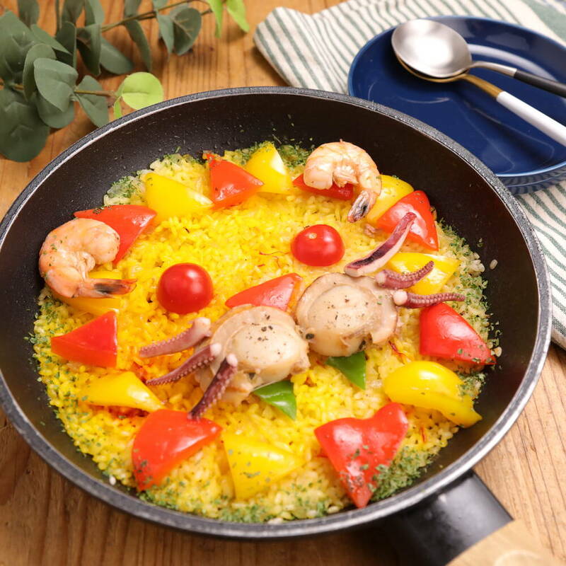 ミニトマトは半分に切る。水、サフラン、コンソメを合わせておく。