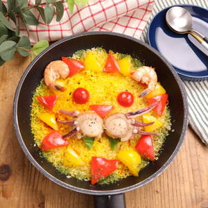 黒こしょう(分量外)をほたての上にかけ、ミニトマトを目の部分におく。 フライパンの周りに乾燥パセリを散らす。