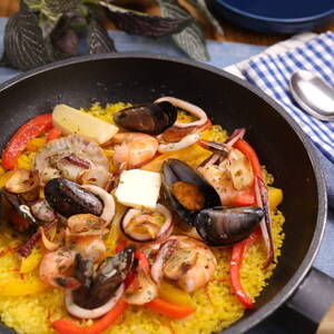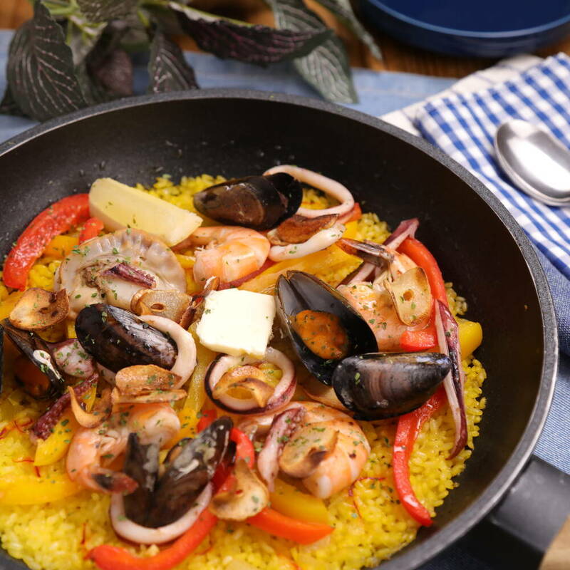 同じフライパンにパプリカ、いか、えび、ほたて、ムール貝を炒める。油が回ったものから取り出す。