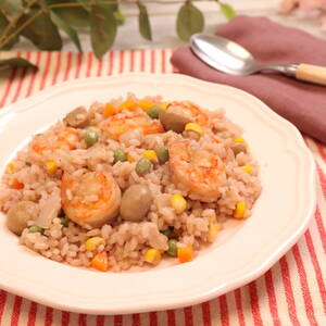 焼き色がついたら玉ねぎ、にんじんを炒め合わせる。しんなりしたら米を加えてさっと炒め合わせる。