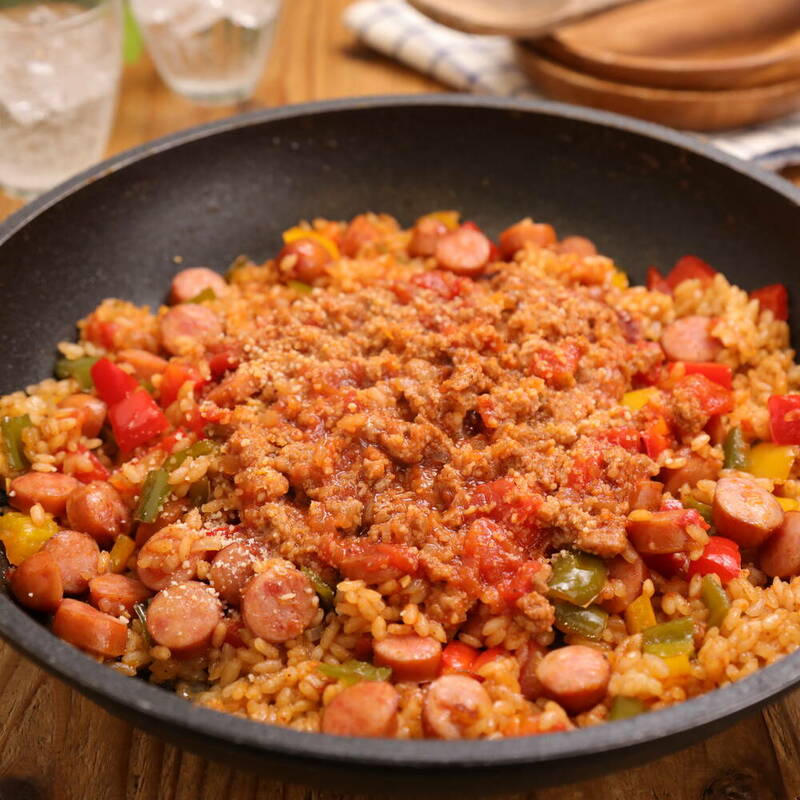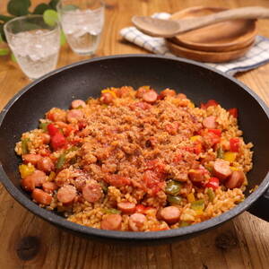 カットトマト、水、コンソメ、残りのケイジャンスパイスを加え、2分ほど煮立たせる。ふたをして中火で10分程度煮る。