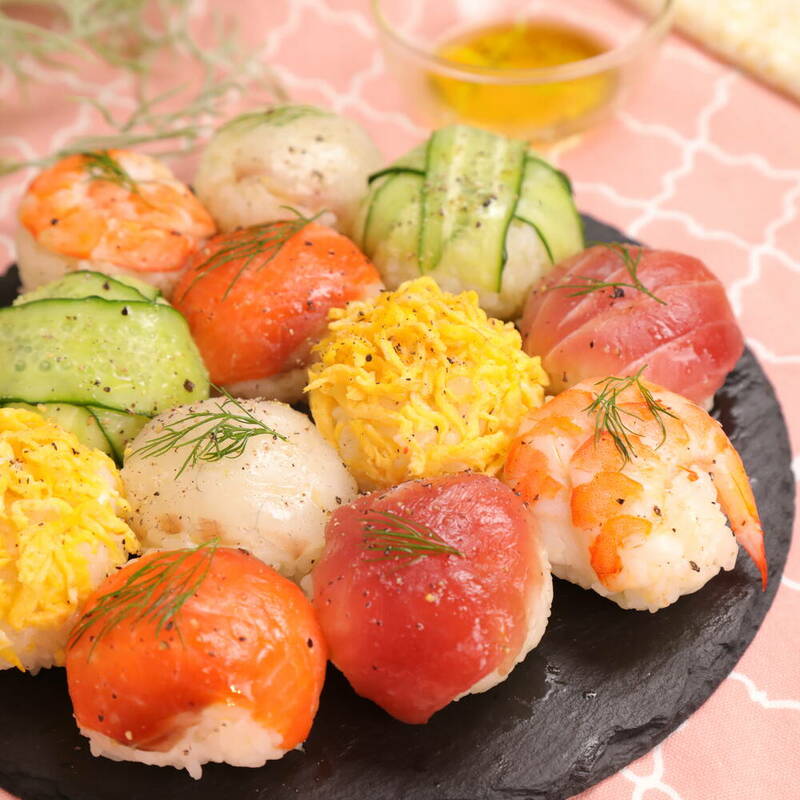 まぐろ、サーモン、鯛は削ぎ切りにする。(できるだけ薄く) ボイルえびは背側から半分に切る。