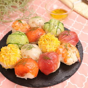 【錦糸卵】<9>をし、酢飯の上にハケで<7>を塗り、<4>をスタンプするようにくっつける。