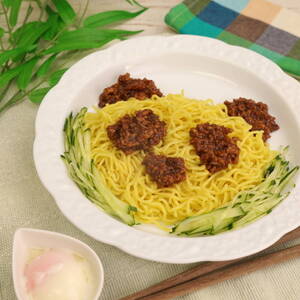 器に楕円形に麺を盛り付け、肉味噌でパンダのデコをする。きゅうりを添える。(笹の葉のイメージ)