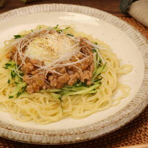 きゅうりを敷いて<5>を盛り付ける。温泉卵を置き、水気を切った白髪ねぎを添える。お好みで山椒をかける。