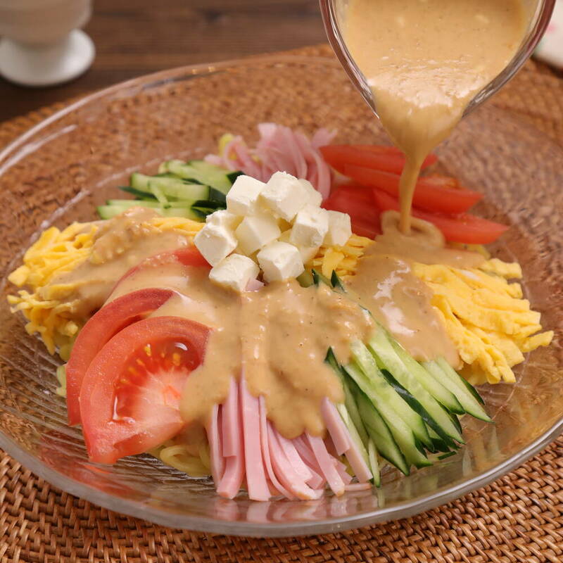 きゅうり、ハム、トマト、錦糸卵をバランスよく盛り付け、中央に角切りにしたクリームチーズをのせる。
