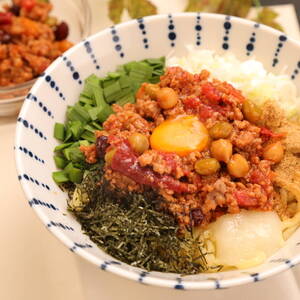 <1>の具材、かつお節粉、おろしにんにく、刻みのりを乗せ、真ん中に<5>を乗せる。 中央を窪ませ、卵黄を落とす。