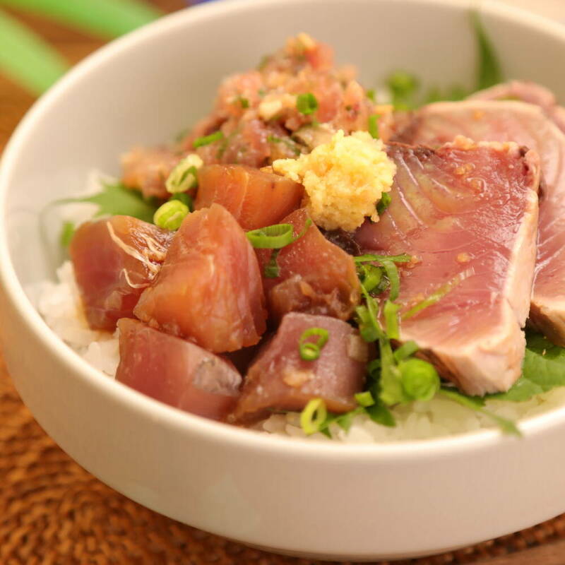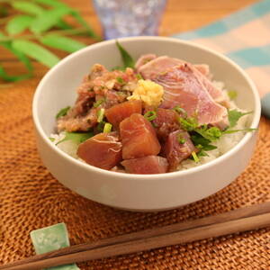ボウルに【A】をいれて電子レンジ(600W)で1分加熱する。粗熱がとれたらかつおの1/3を1cm角に切って浸けておく。