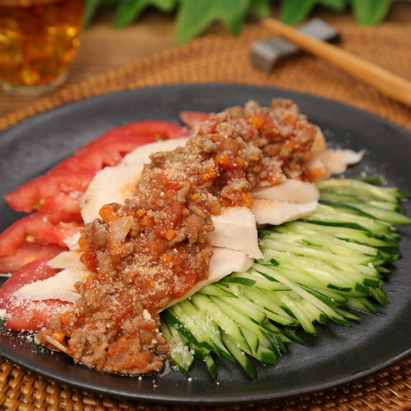トマトは、半分に切り、断面を下にして5mm厚さの薄切りにする。きゅうりは千切りにする。
