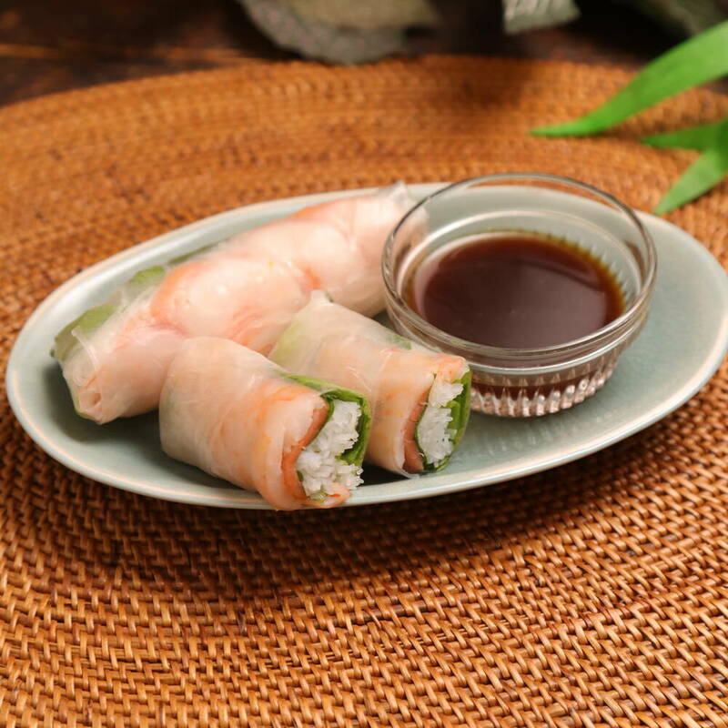戻した生春巻きの皮の内側2cm程を空け、えびを横に並べる。その上にサーモン、大葉、ビーフン、レタスを乗せる。