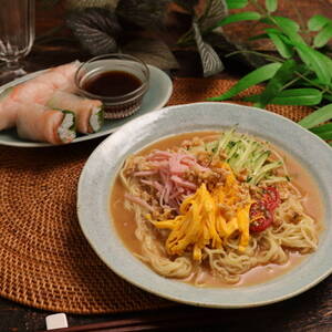 水(分量外)にオリーブオイルを入れて混ぜ合わせる。生春巻きの皮をくぐらせ、まな板の上に置く。