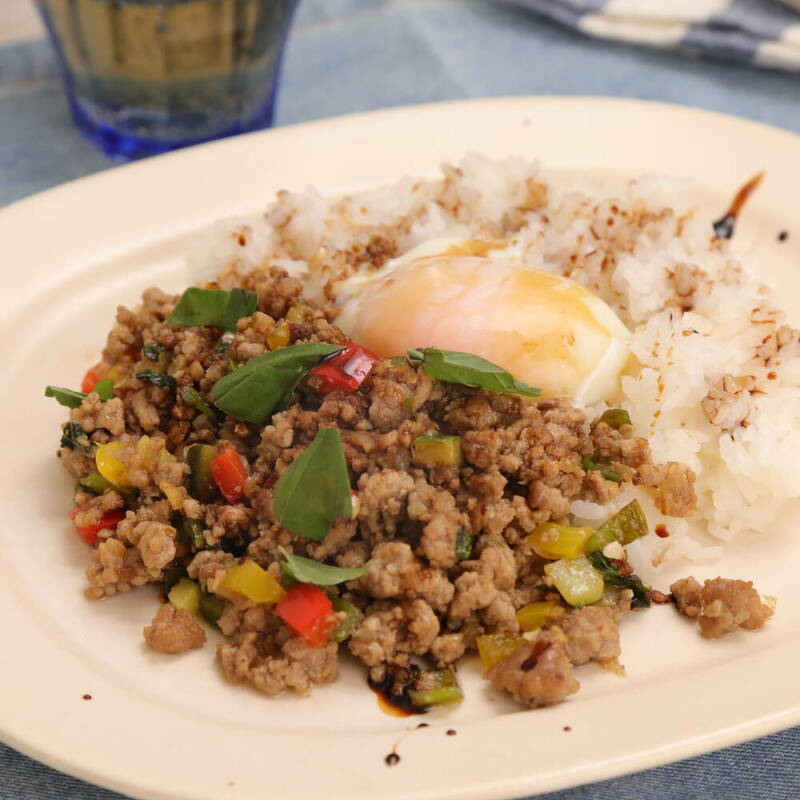 器にごはんを盛り付け、<8>を盛る。温泉卵、バジルをのせ、<9>をかける。