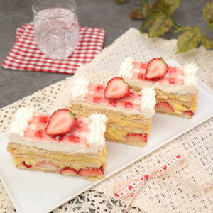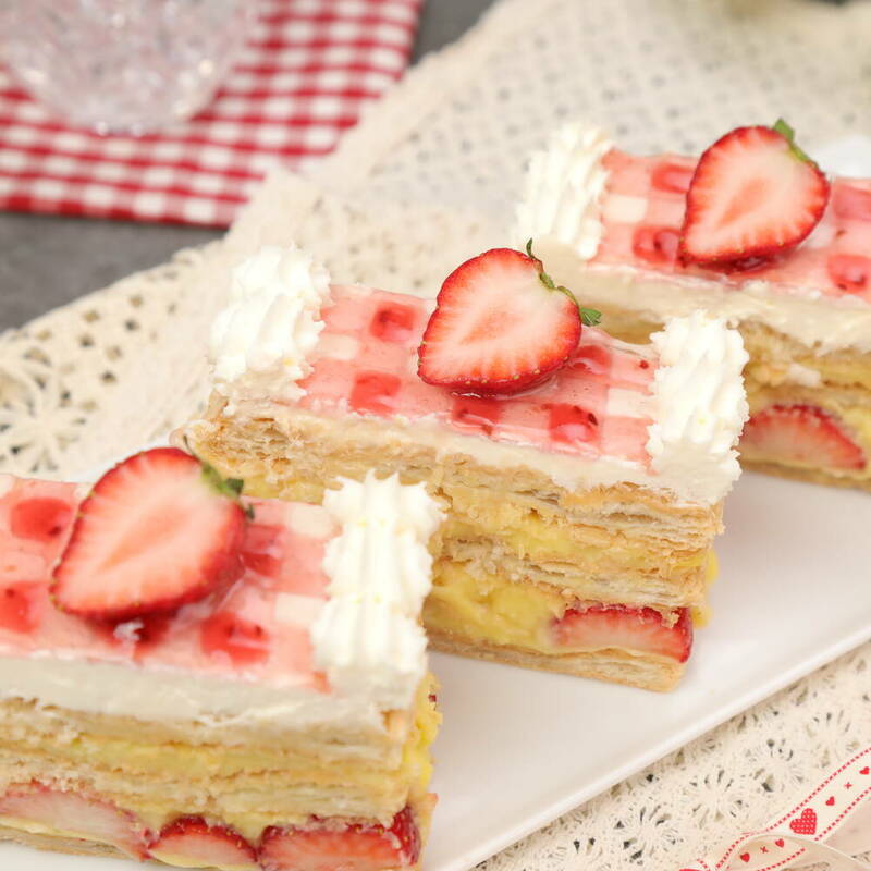パイシートの上に薄くカスタードを絞り、いちごを並べる。いちごの隙間にカスタードを絞り、パイシートを重ねる。