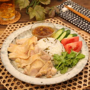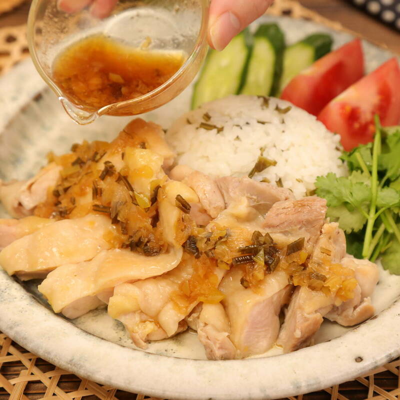 別の器に【カオマンガイだれ】を入れて添える。トマト、きゅうり、パクチーを飾る。