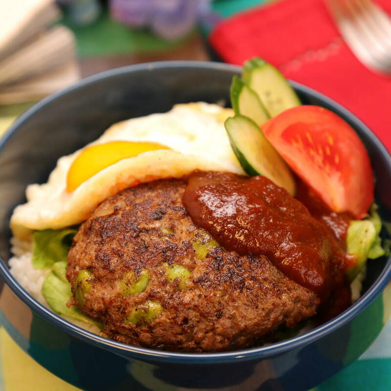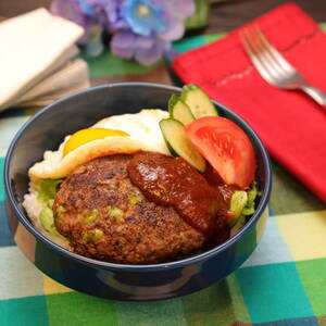 器にごはんを盛り付けレタスを敷く。ハンバーグを盛り付け<3>をかけ、目玉焼きをのせる。きゅうり、トマトを添える。