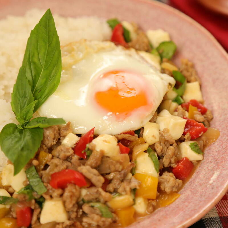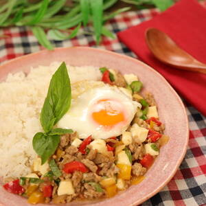 器にごはん、<5>を盛り付け、中央に<6>をのせる。飾りのバジルを添える。