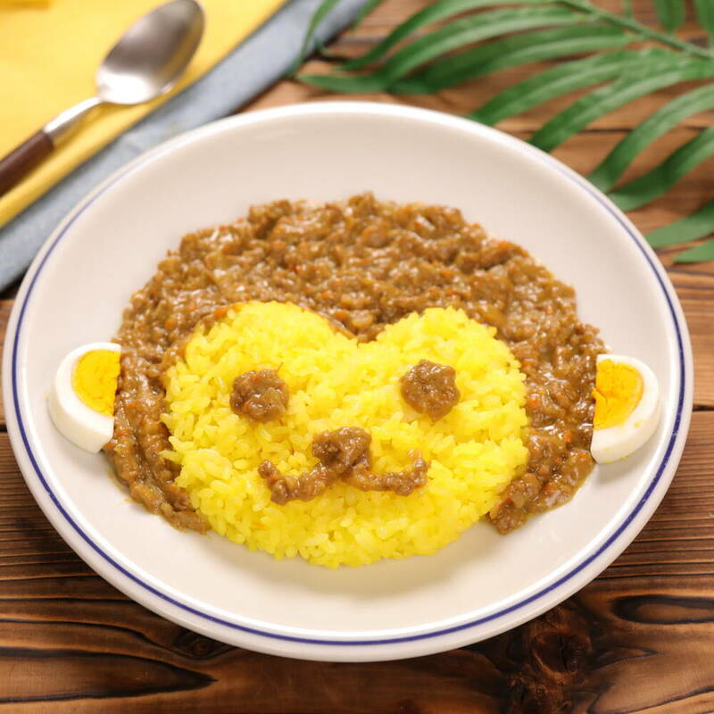 器にごはんを盛り付け、カレールウでおさるのデコをする。ゆで卵を耳に見立てておく。