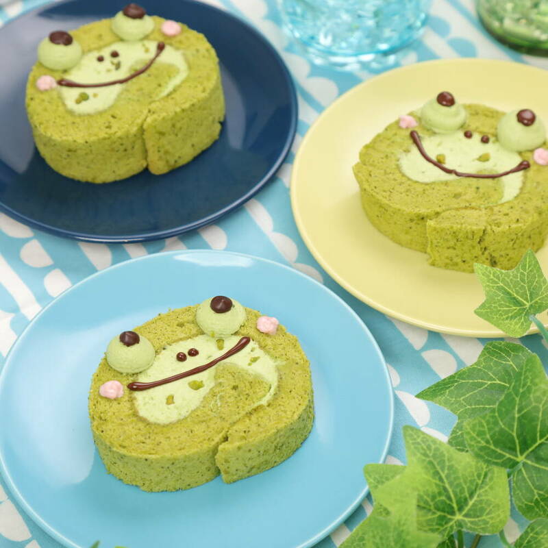 器にロールケーキを置き、抹茶クリームを上方2箇所に絞る。