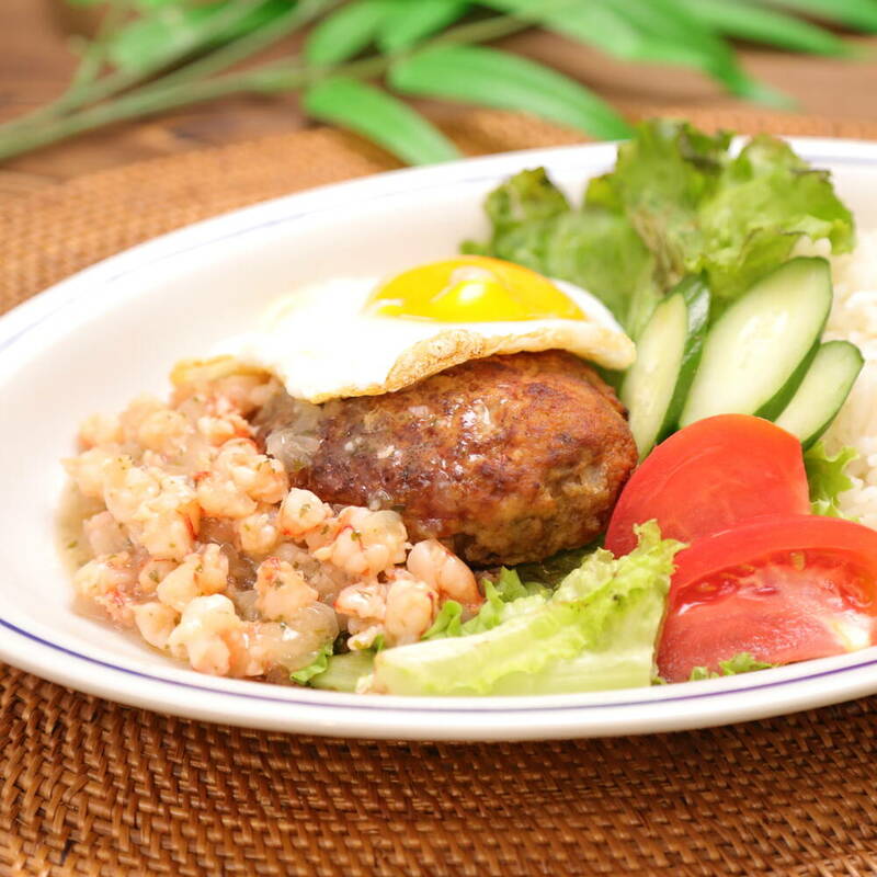 【盛り付け】器の半分にご飯、グリーンリーフを盛る。ハンバーグ、シュリンプソースをかける。