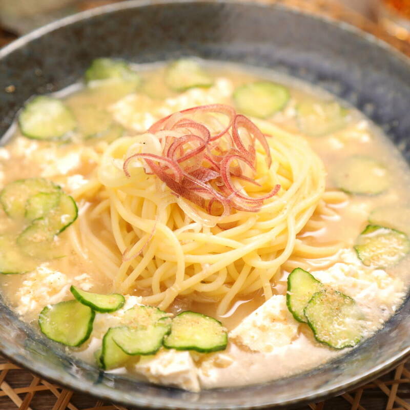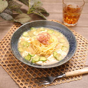 器にスパゲッティ、<7>を注ぐ。すりごまと塩揉みしたきゅうりを軽く絞り散らす。