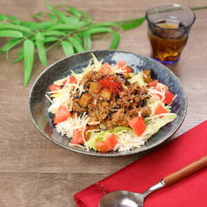 器にご飯、その上に水気を切ったレタスを全体に敷く。<6>を盛り付ける。