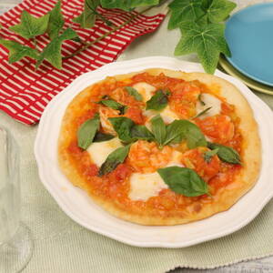 焼き色がついたら上下を返し、<7>をしいてチーズを並べる。ちぎったバジルをちらす。