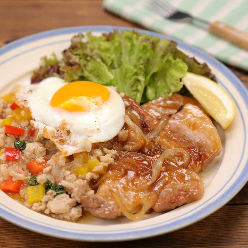 器に生姜焼き、ガパオあん、目玉焼きを盛り付け、レタスとレモンを添える。