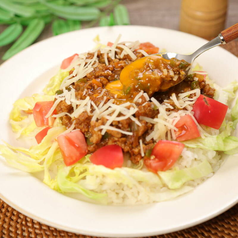 器にご飯を盛り、水気を切ったレタスを全体にのせる。<5>を盛る。まわりにトマト、チーズを散らす。