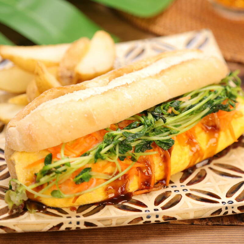 <12>、豆苗を盛る。器にバインミーとフライドポテトを盛り付ける。