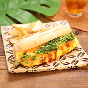 フランスパンにグリーンリーフをちぎって乗せる。とんぺい焼きをのせ、中濃ソースとマヨネーズをかける。