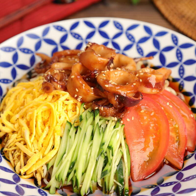 中華麺を規定の時間茹でる。ザルに移し流水でよく洗い、器に盛り付ける。