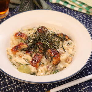 鰻はトースターに入れ2〜3分温め、香ばしさを出す。(アルミにのせる)半分に切り、1cm幅に切る。半分に分けておく。