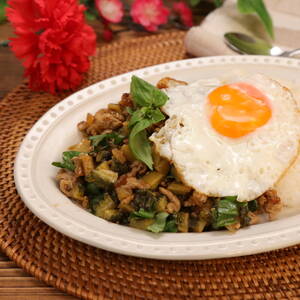 器にご飯を盛り、<5>を盛る。<7>を乗せて<1>のバジルを飾る。