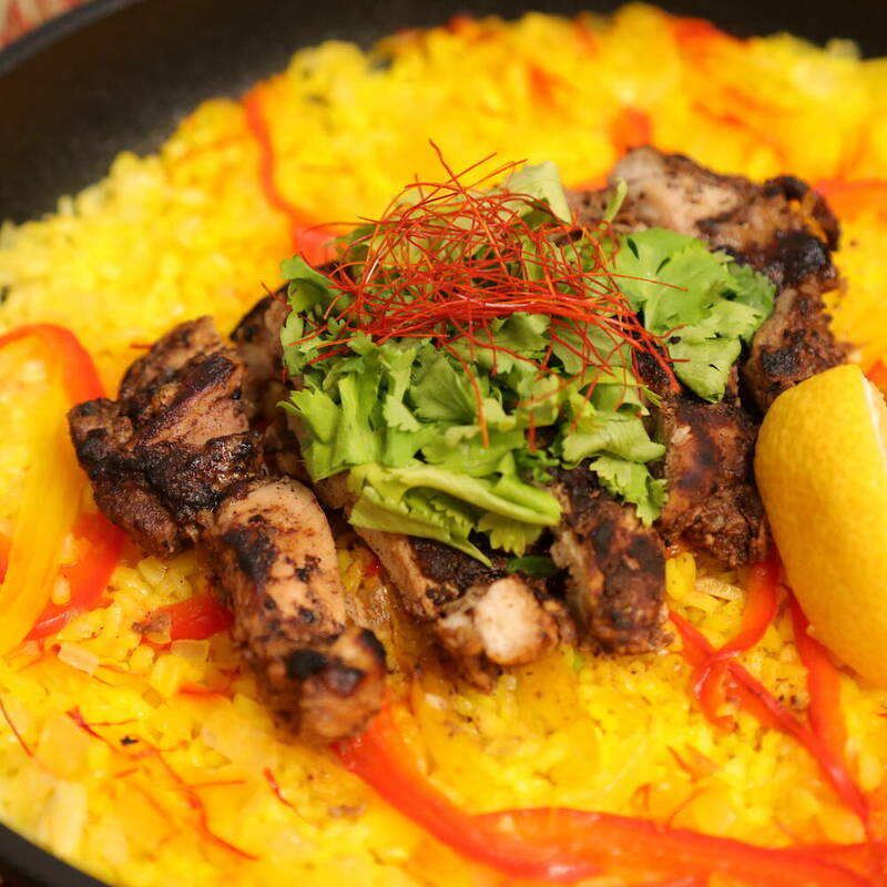 【パエリア】フライパンにサラダ油(分量外)と<1>のにんにくを香りが出るまで炒める。玉ねぎを加えて透明になるまで炒める。
