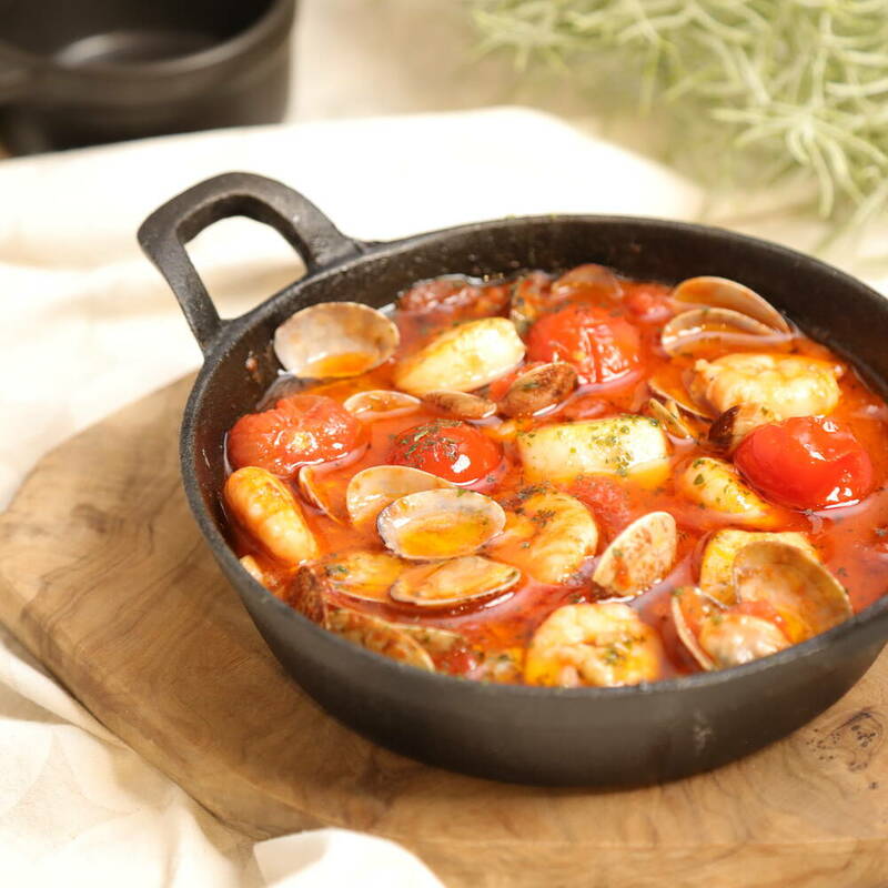 スキレットにオリーブオイル、<5>を入れてじっくりと加熱し香りを出す。