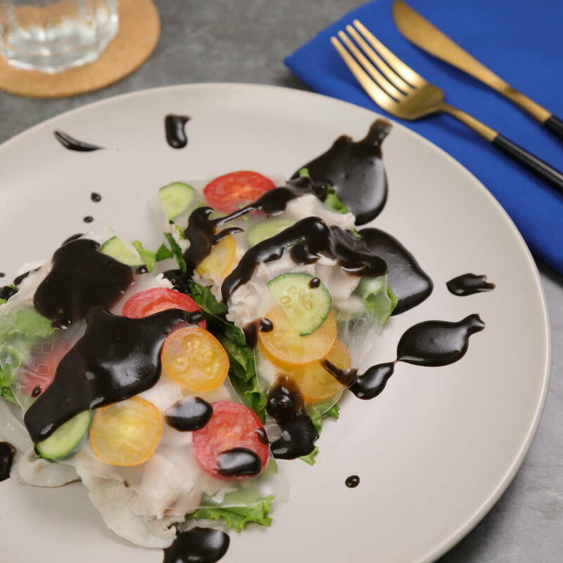 水気を切ったグリーンリーフ、<4>、<2>をのせ、ライスペーパーを<6>と同様に水に潜らせ、重ねるように乗せる。