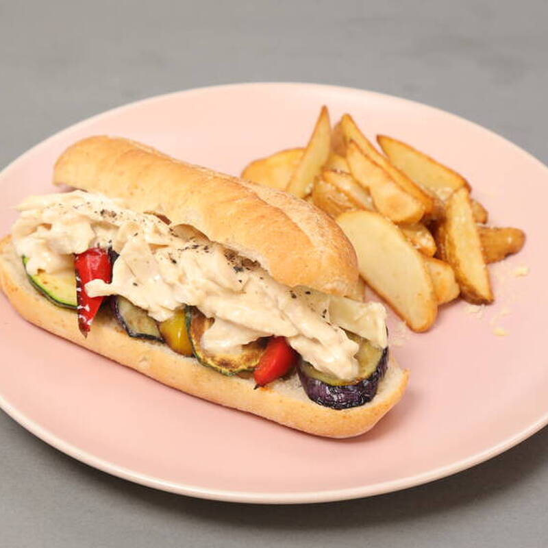 【盛り付け】ソフトフランスパンを半分に切り、夏野菜を2つづつ交互に並べる。