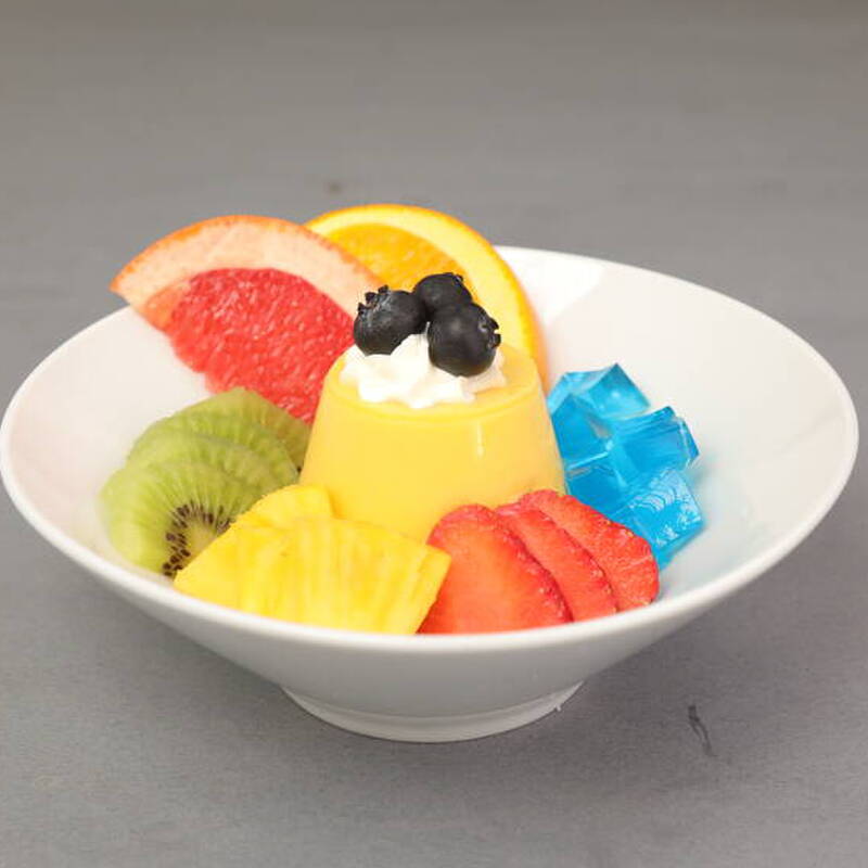 【盛り付け】あんみつ皿にスポンジをおき、上面にホイップクリームを絞る。マンゴープリンはゴムベラを使い型から外してのせる。
