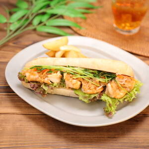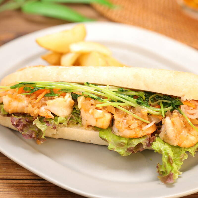 フランスパンに、グリーンリーフをちぎって敷く。ガーリックシュリンプ、<11>、豆苗を盛る。