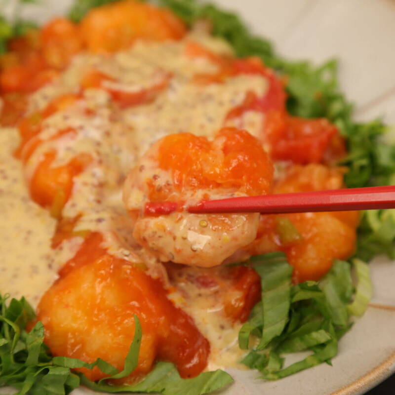【A】を加えて混ぜながらとろみがついたらエビを戻し、さっと混ぜ合わせる。
