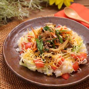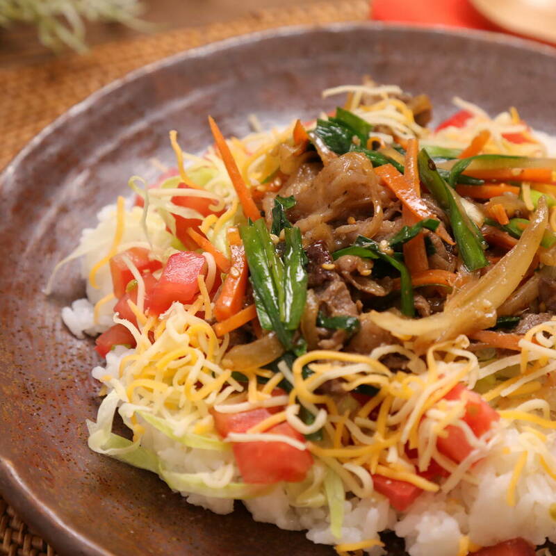 器にごはんを盛り付けレタスを敷く。<6>を乗せ、周りにトマト、シュレッドチーズを散らす。