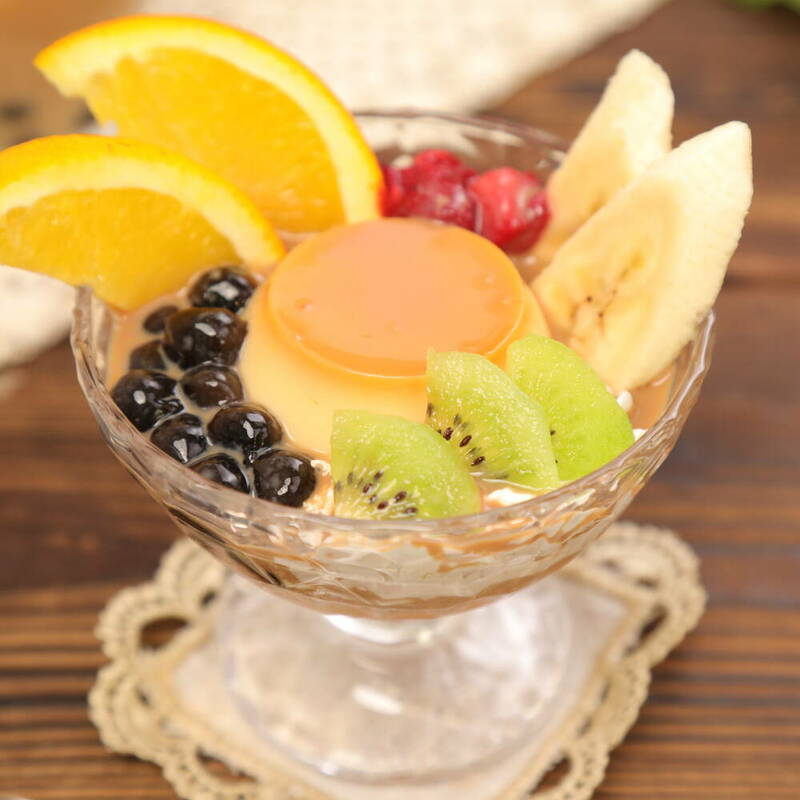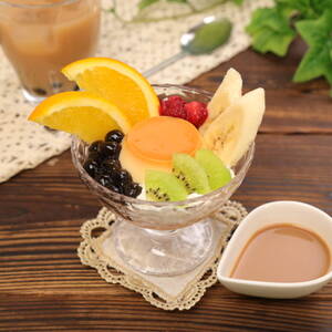器にプリン、タピオカ、オレンジ、バナナ、冷凍ラズベリーを盛り付ける。ホイップクリームを絞り、キウイをのせる。